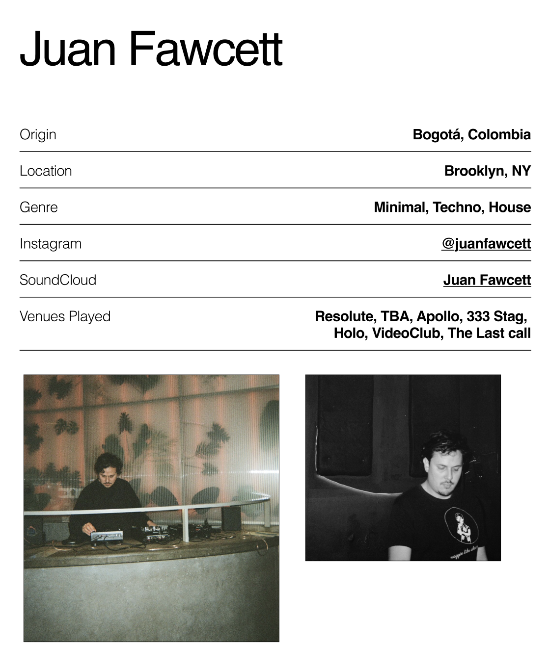 Influenced by the underground scene in his hometown of Bogotá and the vibrant local scene in Brooklyn since 2020, Juan has evolved into a passionate record collector, selector, and DJ. Drawn to minimal, spacey, and organic sounds, he aims to craft immersive sets that tell a story—building toward a dynamic climax that evokes movement and deep engagement with the music.