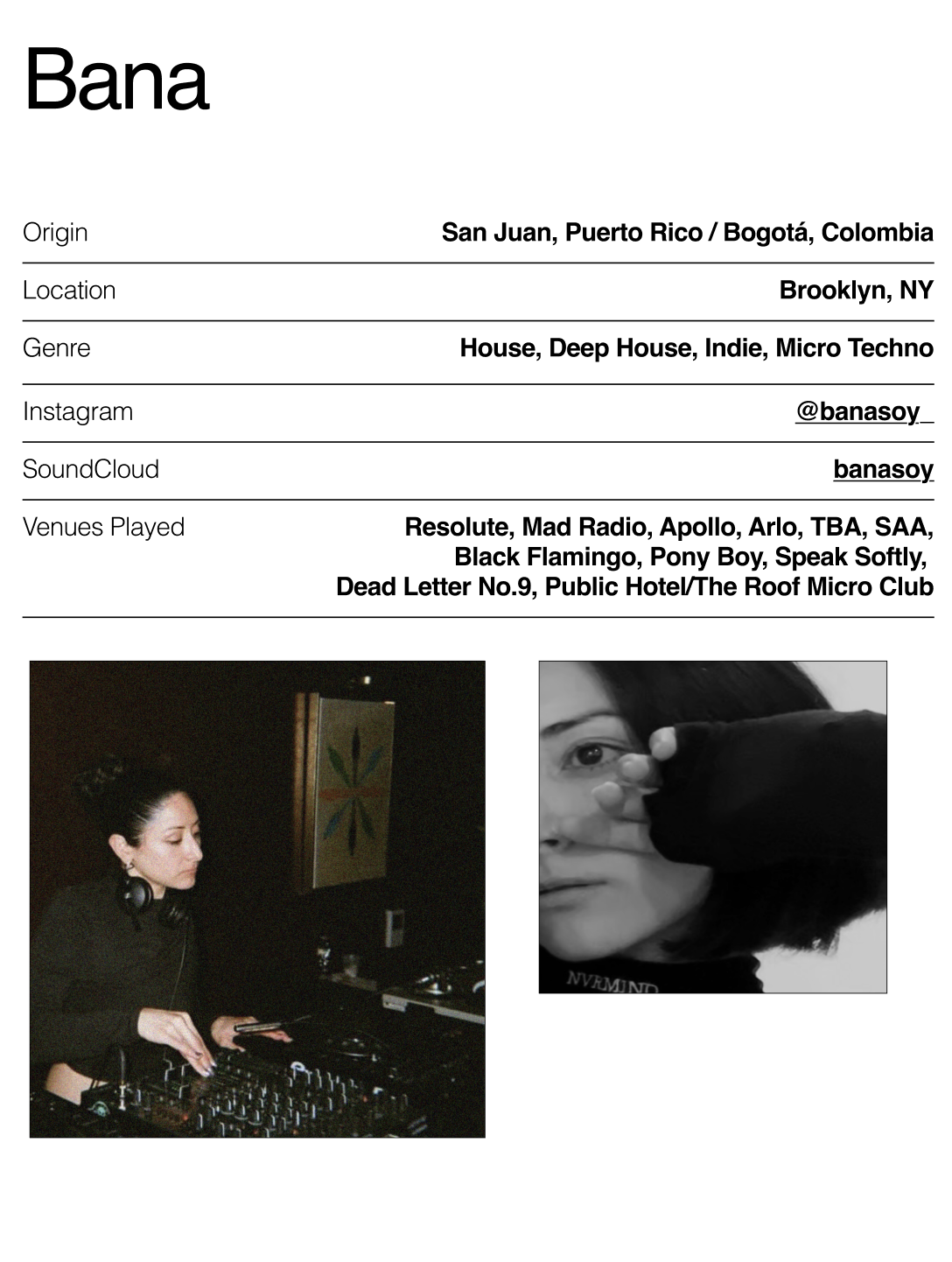 Traces of her heritage inform her rhythmic sensibility, while her performances blur the line between dancefloor energy and emotional release. Bana has played at some of New York City’s most respected venues, including ReSolute, Ponyboy, Black Flamingo, Apollo Studio, Arlo Williamsburg, Café Balearica, TBA, Speak Softly, XPizza, Dead Letter No.9, Black Flamingo, Public Hotel/The Roof Micro Club, and SAA.