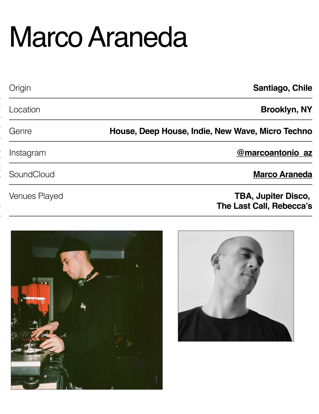 Marco Araneda is a DJ, music producer, and co-founder of Audio Studio, originally from Santiago, Chile, and now based in New York City. With musical training from respected artists such as Apste, Djolee, Matias Spataro, Manuel Sahagun, InAscent, and Alejandro Vivanco, Marco has cultivated a sound that is both refined and deeply personal.